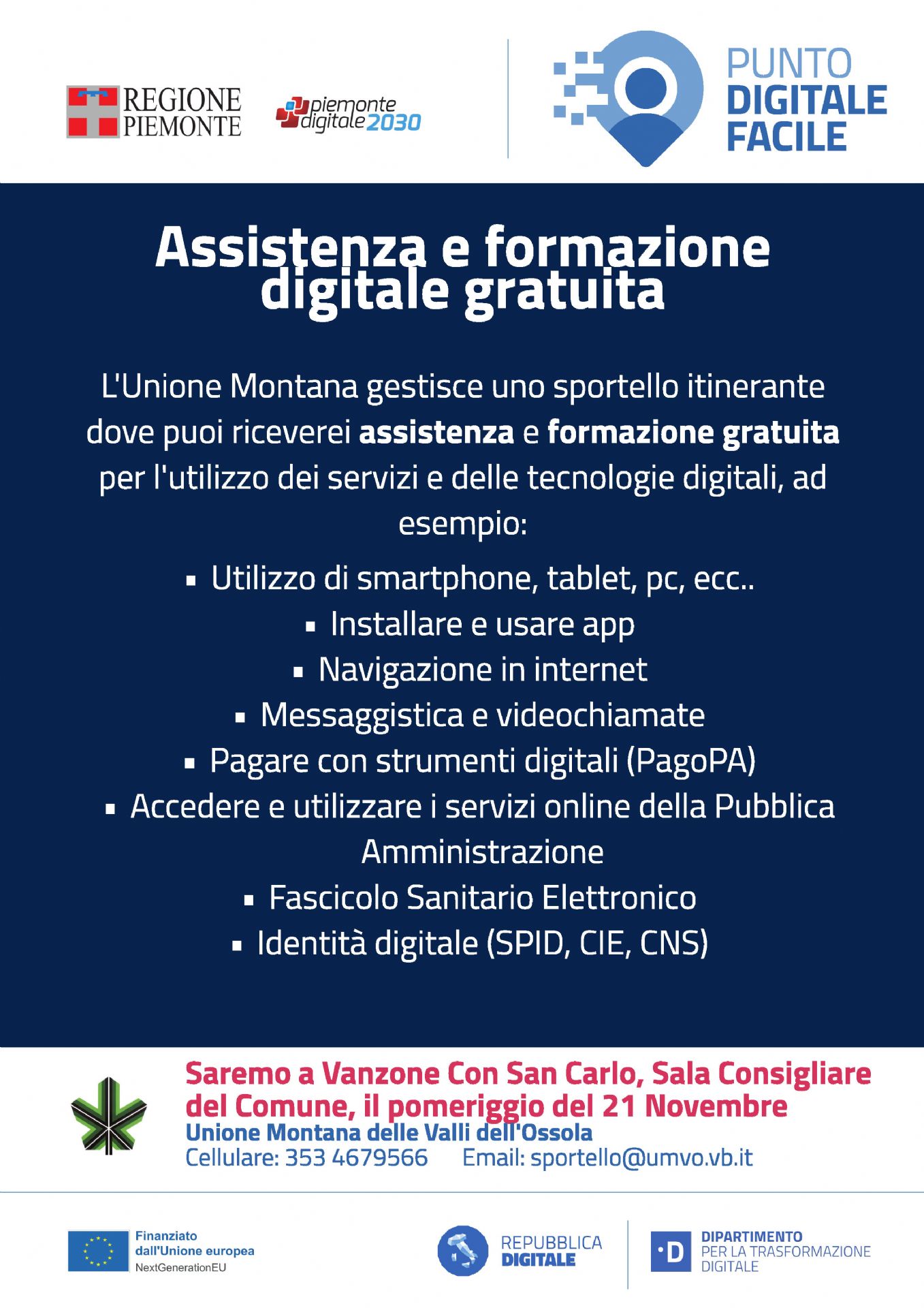 L'Unione Montana gestisce uno sportello itinerante dove puoi riceverei assistenza e formazione gratuita per l'utilizzo dei servizi e delle tecnologie digitali