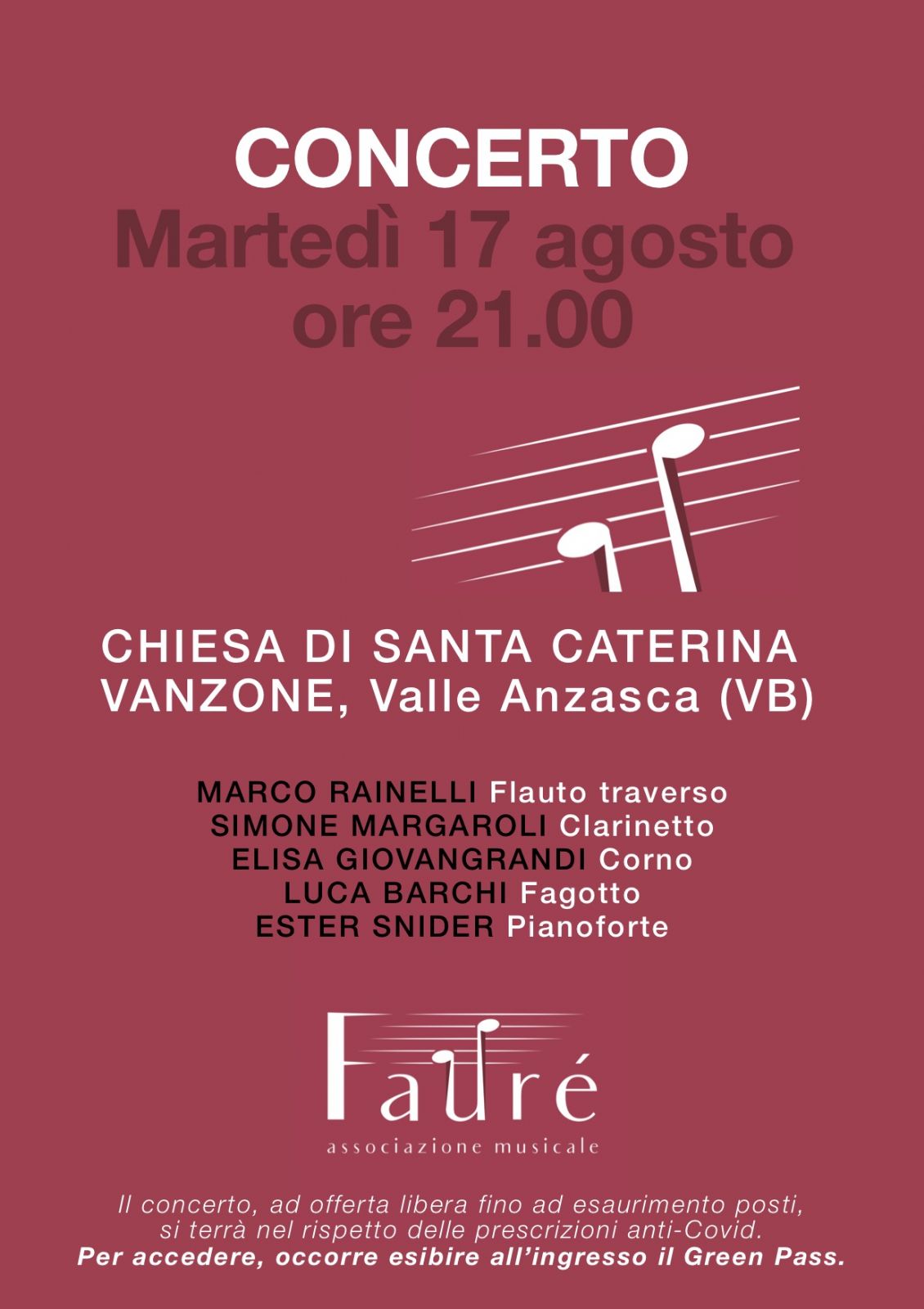 MARCO RAINELLI Flauto traverso, SIMONE MARGAROLI Clarinetto, ELISA GIOVANGRANDI Corno, LUCA BARCHI Fagotto, ESTER SNIDER Pianoforte