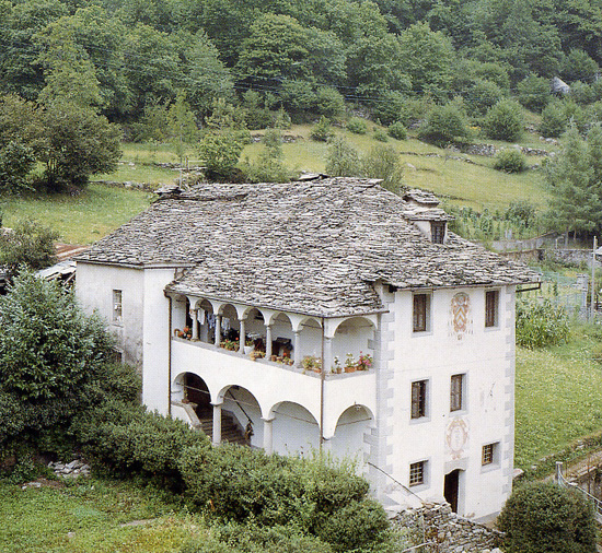 Casa seicentesca con il tipico loggiato a portico ossolano su due ordini con colonne in pietra: tre archi inferiori e sei superiori.